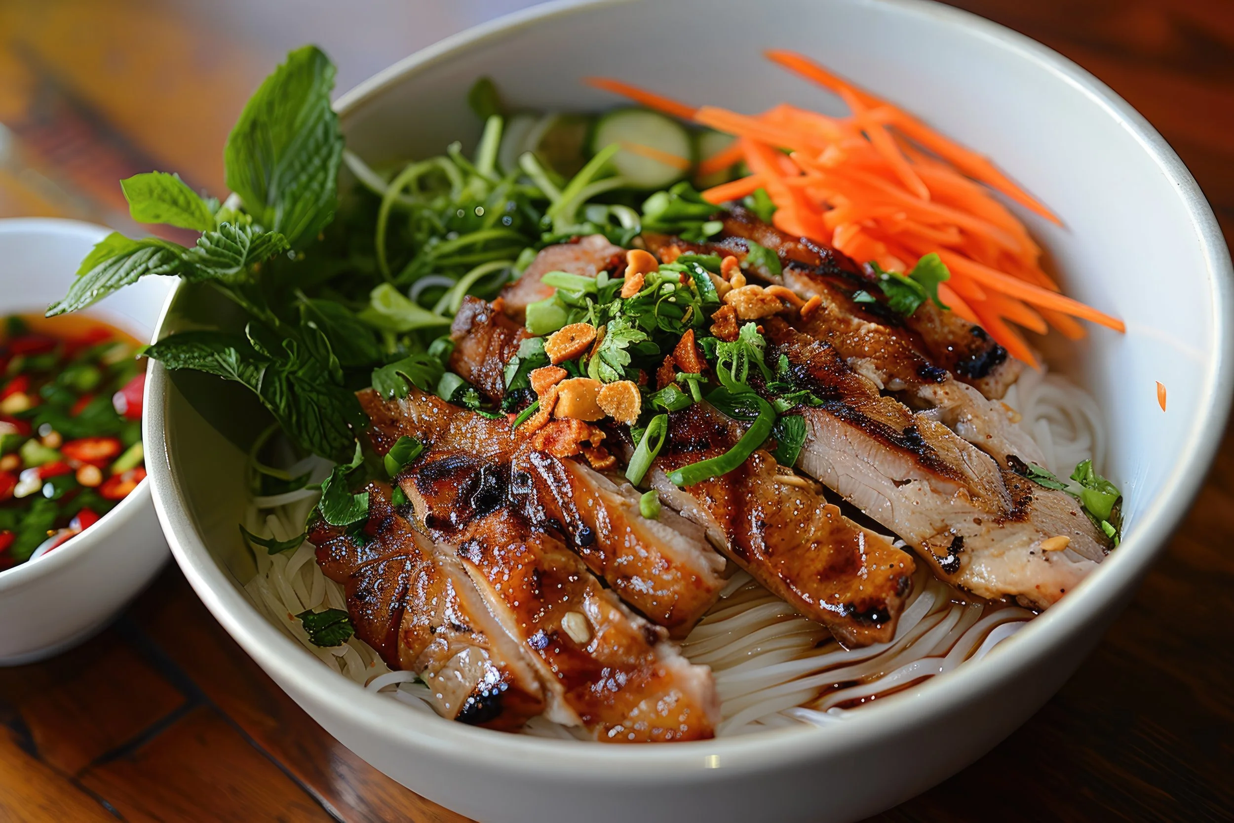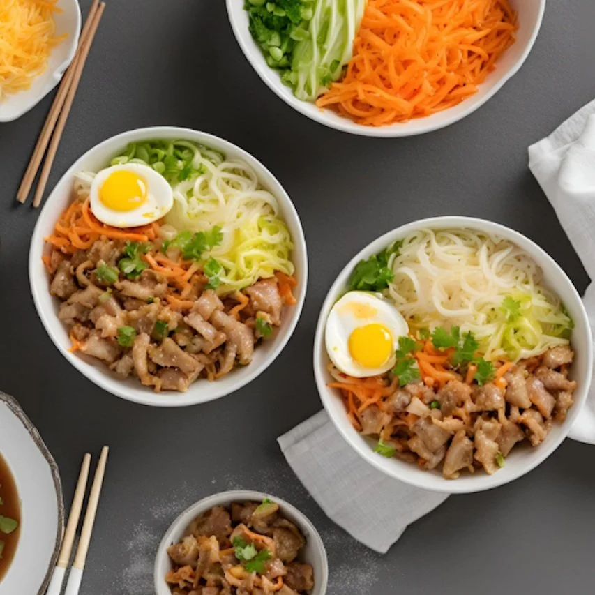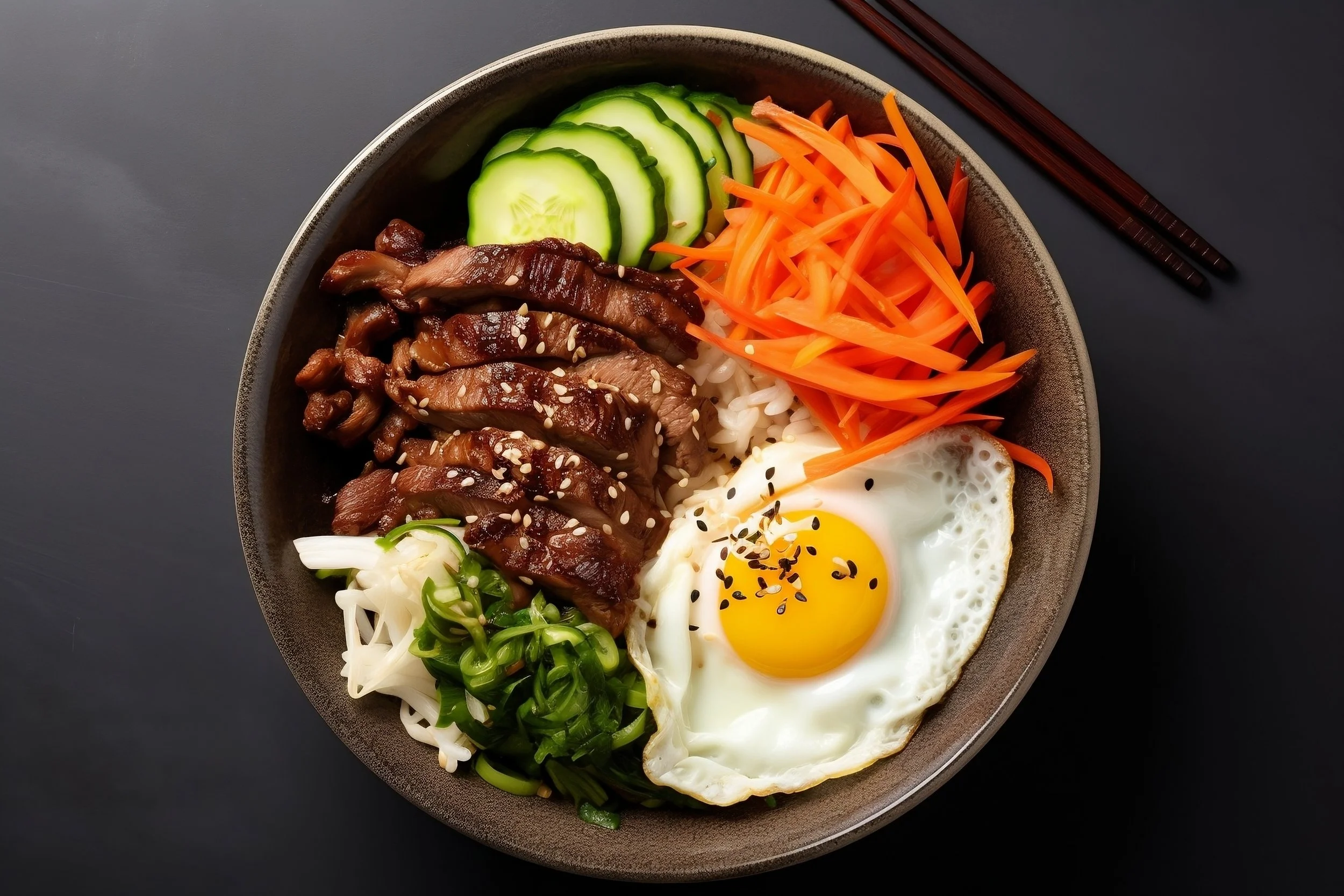 Whisk all of the marinade ingredients and pour over the beef, stirring it in. Allow the marinade to sit in the fridge for at least 20 minutes and up to one day, covered. Grill or saute the beef in cast-iron until just cooked through. If using cast-iron, then broil the beef in the oven for 5 minutes to get a little char on the edges. Serve immediately with the sides, including blanched carrots (simmered in water for a few minutes), cucumbers, eggs, cilantro, and optional white rice.