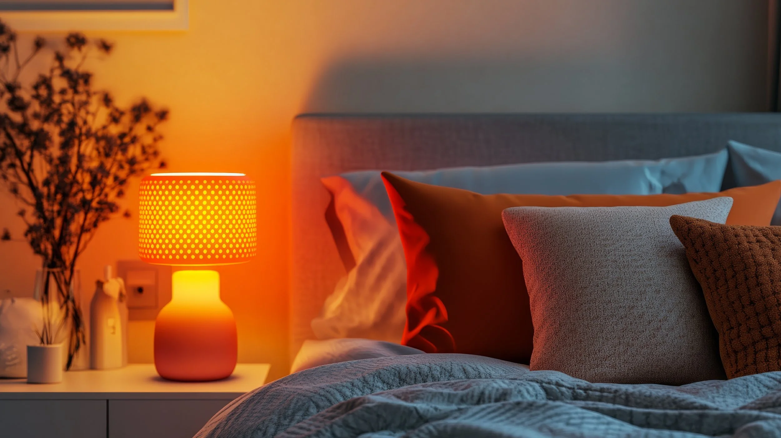 Switch to amber light bulbs or red night lights in your bedside lamp and bathroom at night.